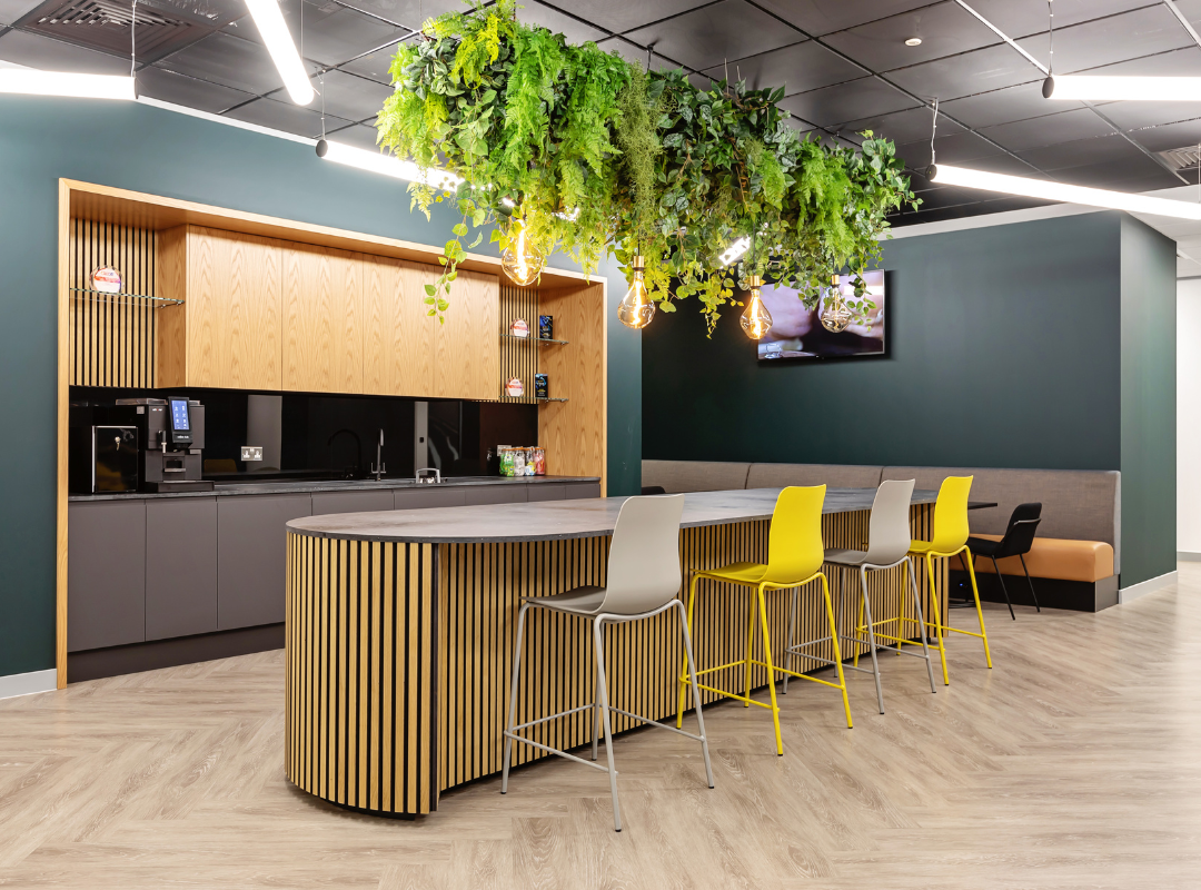At leading law firm, Irwin Mitchell, our workplace refurbishments in Birmingham, Bristol and Southampton we designed and built stunning breakout areas with ample kitchens in each. These breakout areas had to be large enough for the whole team to comfortably take breaks as well as being kitted out to the highest standard so that their busy, hard working lawyers could refuel throughout the working day.