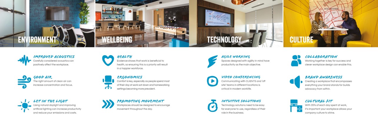 For over two decades businesses across the UK have trusted us to design and build positive workplaces for their office relocation and office refurbishments. We create environments where your team want to work, encouraging flexible ways of working and future proofing offices for the years ahead.