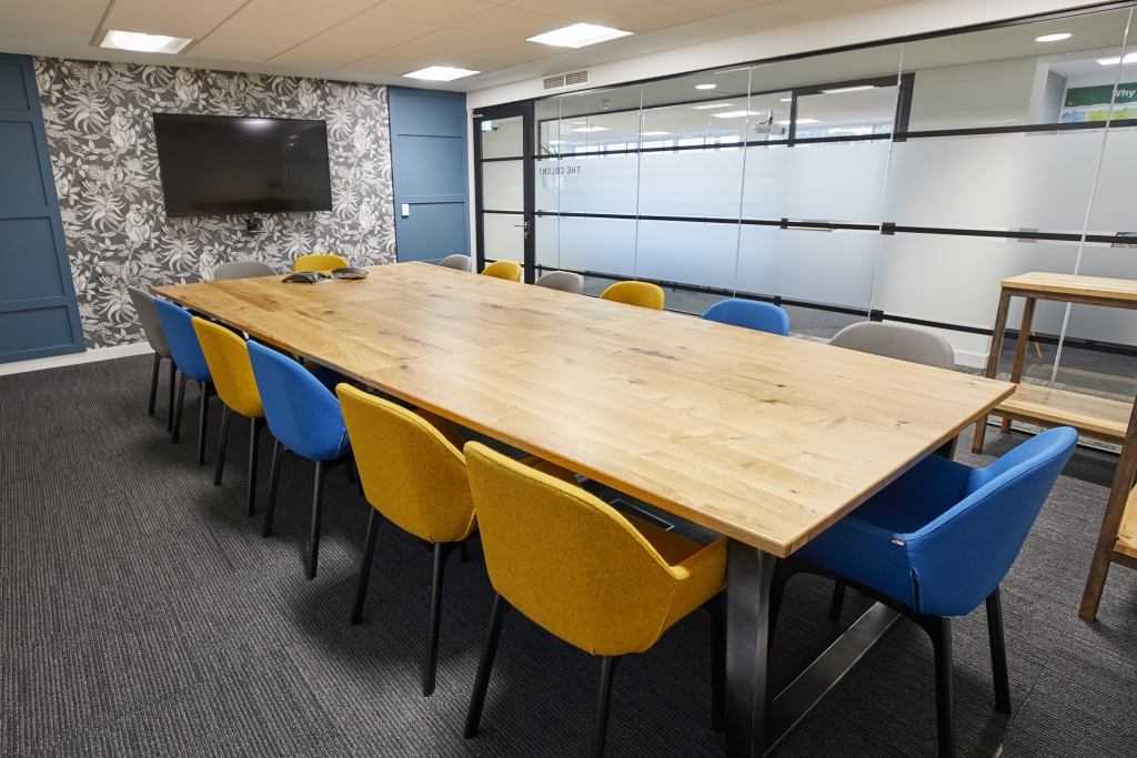 The facility provides large format rustic refectory tables, fixed and bookable desk spaces, 2-person study rooms as well as VC equipped meeting and training rooms. All of the spaces have been carefully personalised to reflect the care and attention of their offering and the leisure side of their business.