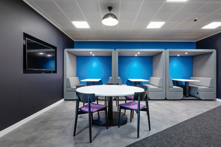 Flexible work set ups including booths and collaboration tables sit alongside static desks for focused work. There are private offices for the leadership team alongside additional meeting spaces and an executive boardroom. Several breakout areas, a full-size staff restaurant and a large games area with pool and table tennis create ample space for the team to recharge.