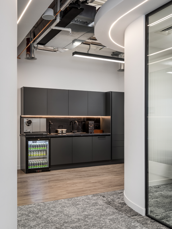 The space flows with curved ceiling lighting, biophilic design, clean lines, premium furniture and subtle, brand-led wall art. Professional lighting rigs frame the two staging areas, creating ample natural light for live streaming to the media. The breakout area boasts a proper barista coffee machine, a full bar set up and a huge staff kitchen to keep the team fueled.