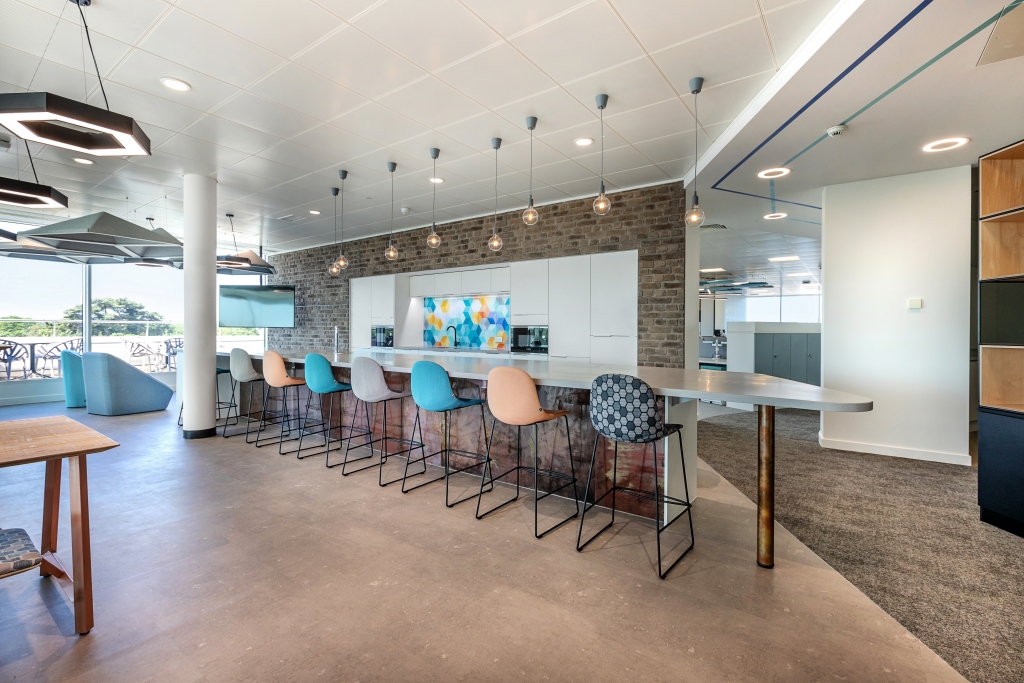 This CAT B fit out included a large breakout area which is the focal point of the new workplace. It has an energizing aesthetic made of beautiful textures, colours, natural daylight and enviable facilities.