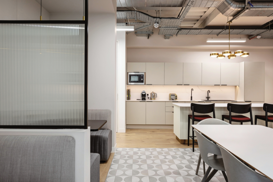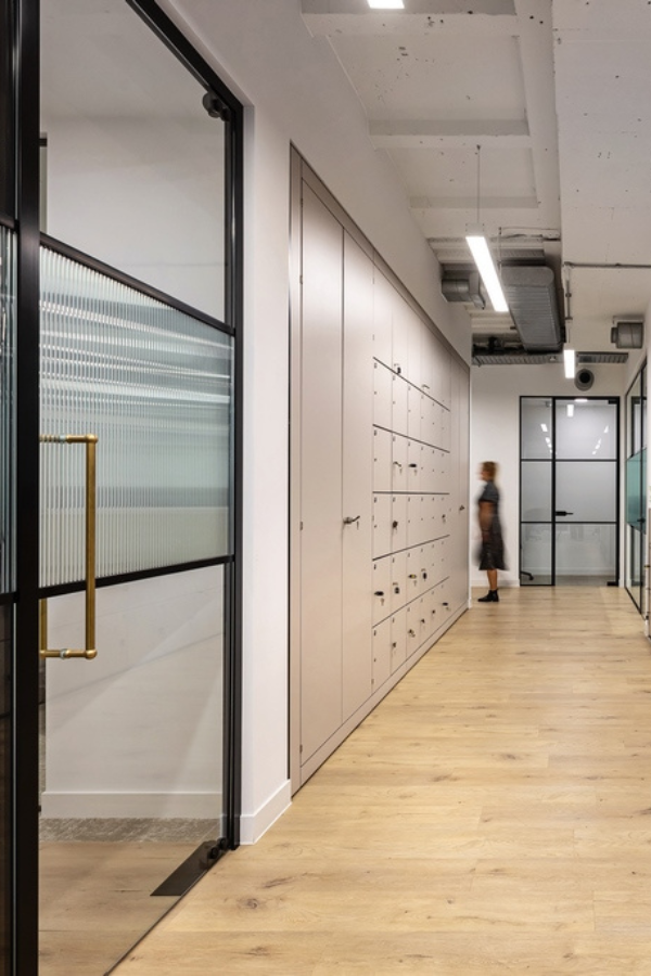 This was a full CAT B fitout with all new flooring, partitions, meeting rooms, wall finishes and furniture. High-end materials and sleek Crittall glass partitions bring a polished edge to the workplace, while carefully chosen furniture adds comfort and character. Custom joinery adorns the spaces with new cabinetry, lockers, planting and storage. The custom build reception desk and custom fluted kitchen fitout finish the look.